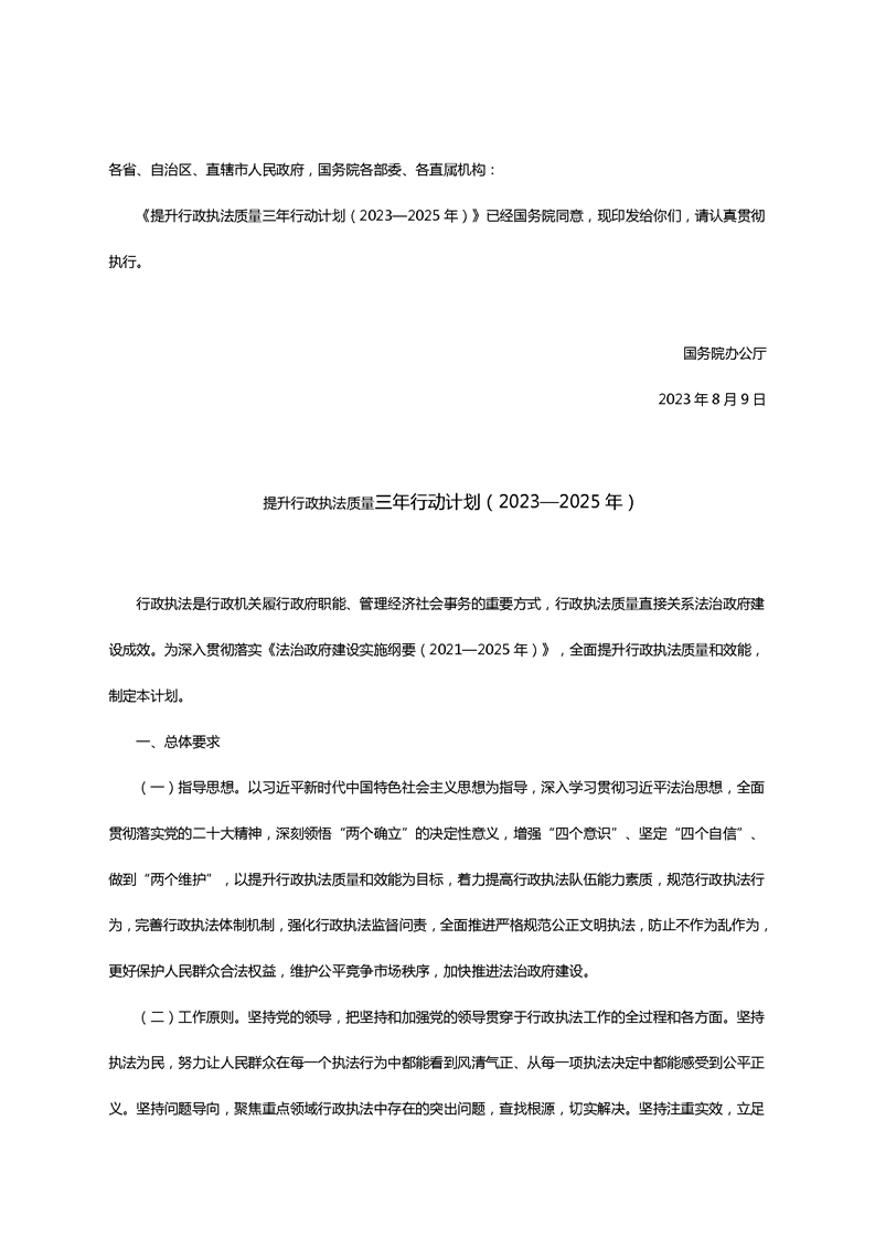 国务院办公厅关于印发《提升行政执法质量三年行动计划(2023—2025年)》的通知